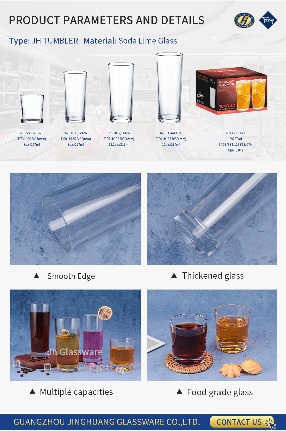 Elevate your beverage service with JH Glassware’s premium highball glass tumbler set. Since 1993, JH Glassware (Guangzhou Jinghuang Glassware Co., Ltd.) has been a trusted global manufacturer of high-quality glassware, and this collection combines timeless minimalist design with exceptional durability. The classic straight-sided shape complements any table setting, making it the perfect choice for daily home use, commercial hospitality, and special occasions. Whether serving water, juice, iced tea, craft cocktails, or soft drinks, these tumblers bring elegance and functionality to every sip.
